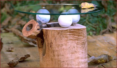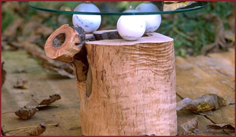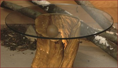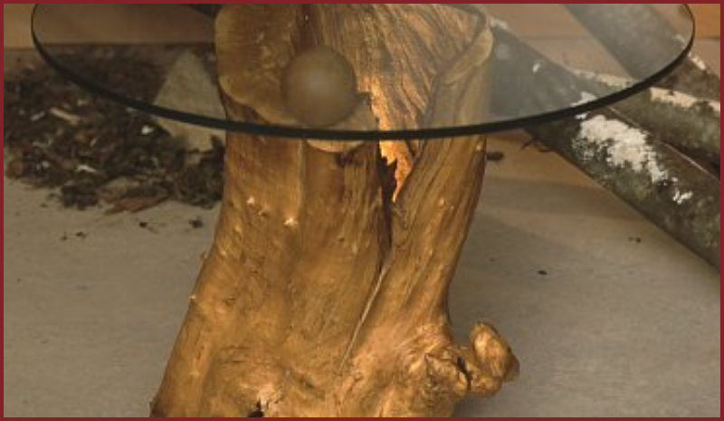 Beistelltisch aus einem hohlen Apfelbaumstück. Die Glasplatte
